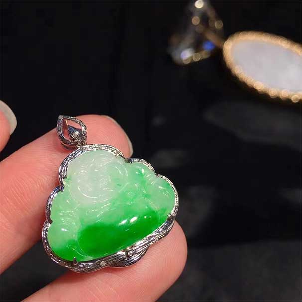 2、在选择这种纯色吊坠的时,要确保它的面部干净无瑕。侧面不存在飘花,这些正是影响翡翠吊坠整体美观度和价格的重要因素。所以在选择翡翠佛公时,务必注意面部的洁净度,还有就是面部的雕刻要拥有圆润饱满的线条,五官比例要和谐。